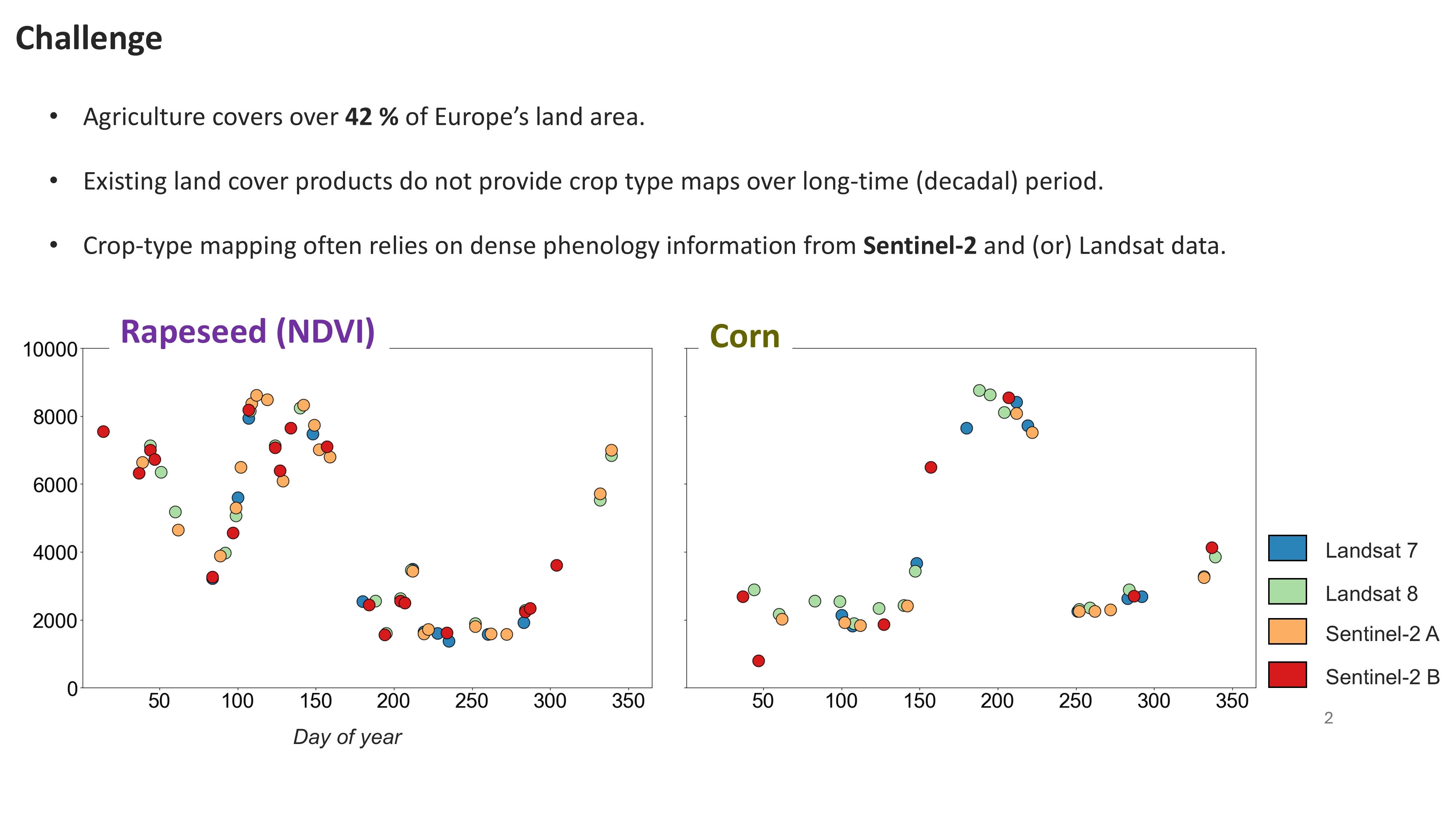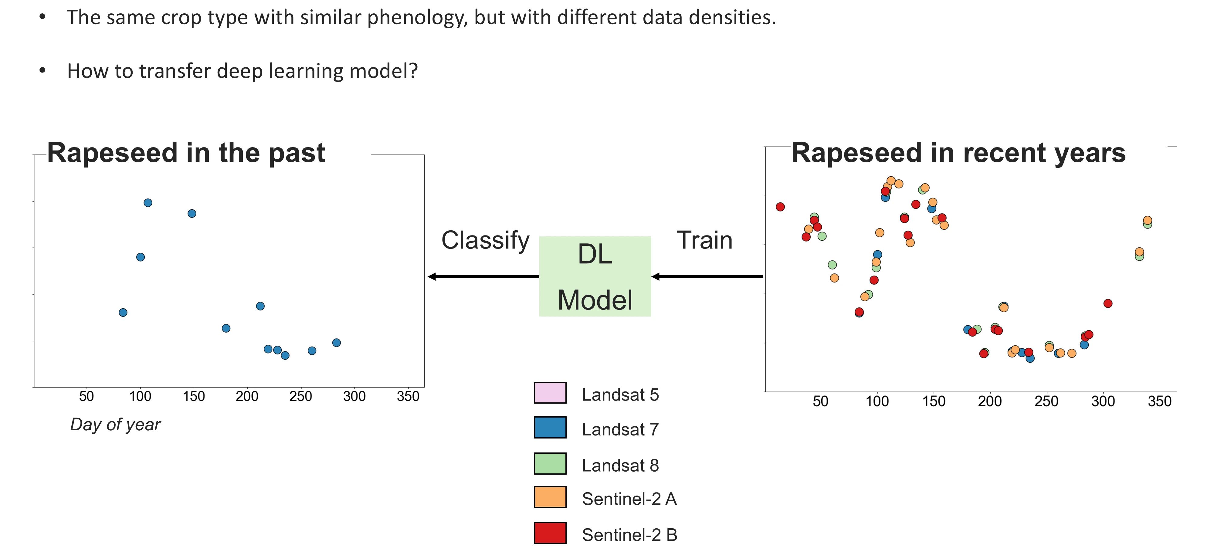 - Consequently, DL models trained on dense Sentinel-2 series must often be transferred to periods when only Landsat data are available.